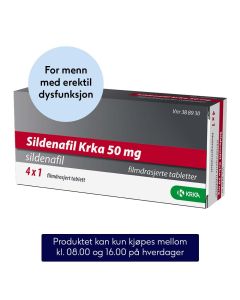 Viagra Reseptfri/Sildenafil Krka tabletter 50 mg. Inneholder sildenafil. Reseptfritt legemiddel til menn over 18 år for behandling ved impotens. Ta 1 tablett ved behov ca. 1 time før seksuell aktivitet. Maks 1 tablett per døgn. Seksuell aktivitet kan belaste hjertet – informer farmasøyt om hjerteproblemer. Helsesjekk hos fastlege anbefales innen 6 måneder. Les pakningsvedlegget nøye før bruk.