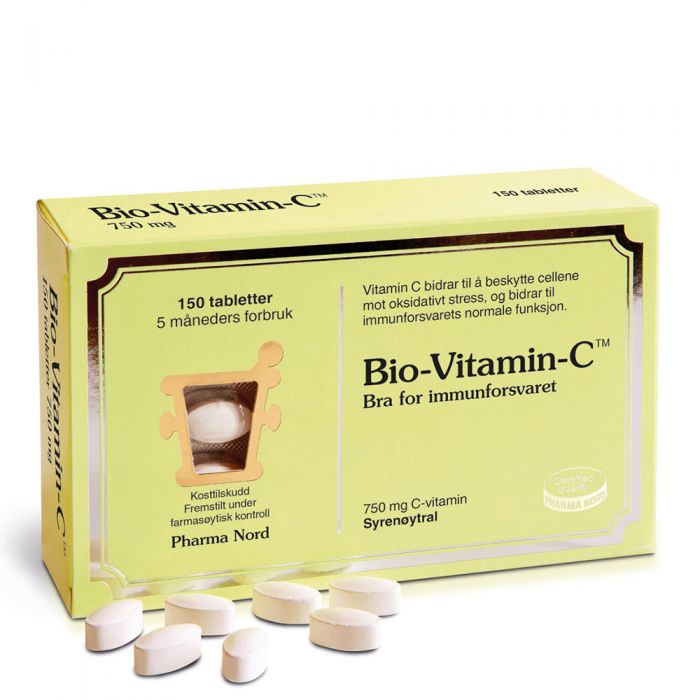 Bio-Vitamin-C er tabletter a med 750 mg vitamin C i form av syrenøytral kalsiumaskorbat. Bio-Vitamin-C kan tas med eller uten mat. Tabletten kan også løses opp i et glass med lunket vann. Vitamin C bidrar blant annet til å beskytte cellene mot oksidativt stress, bidrar til normal kollagendannelse og øker opptaket av jern.Dosering og bruk