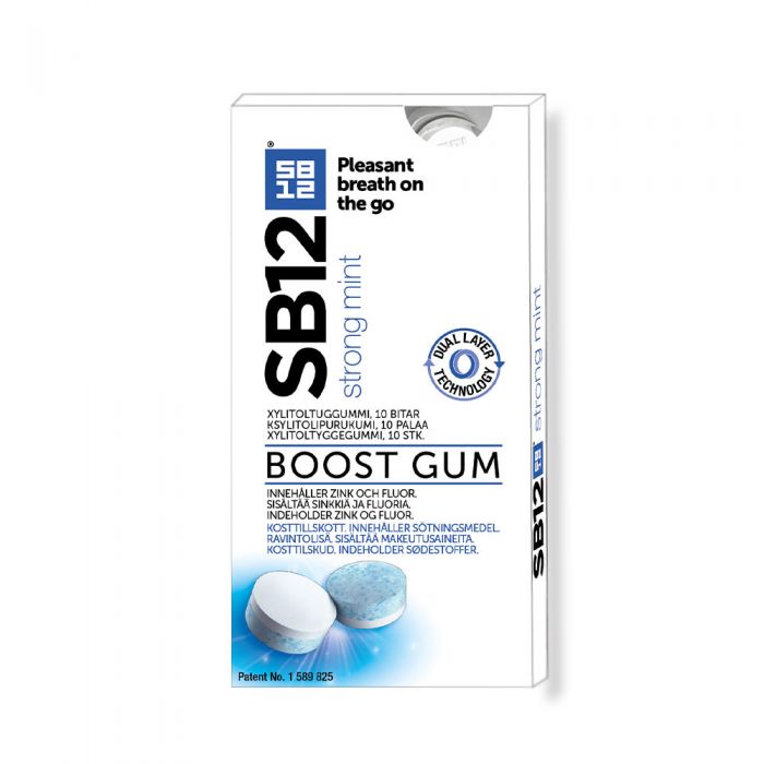 SB12 boost er en sukkerfri tyggegummi med fluor som motvirker dårlig ånde i opptil 3 timer.